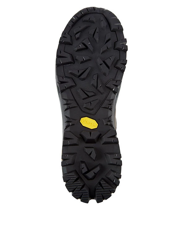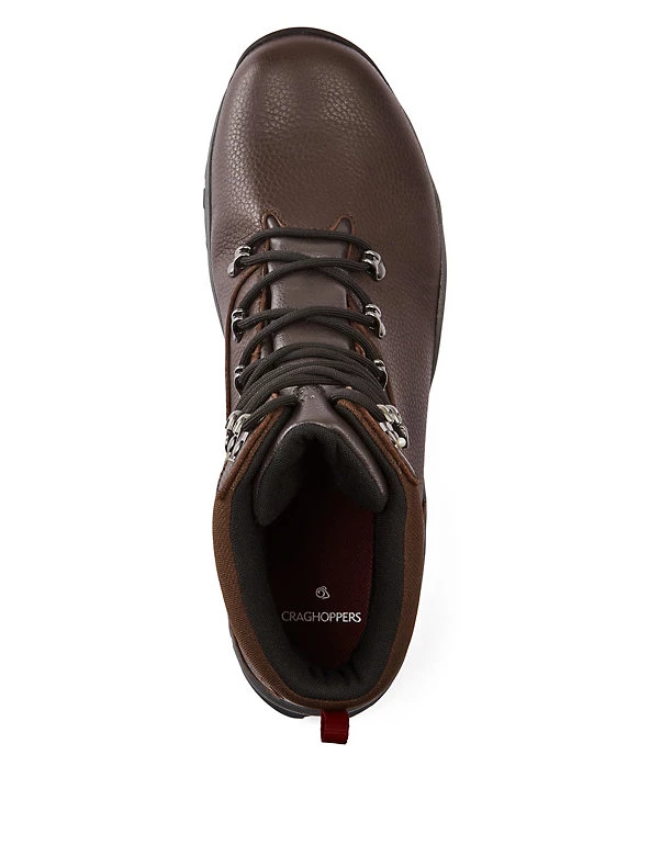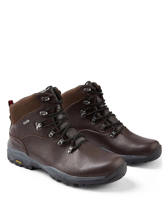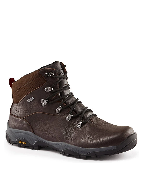 Take the great outdoors in your stride with these waterproof walking boots from Craghoppers. They’re crafted from durable leather in a regular fit, with a padded collar and tongue for comfort. The thick lace fastenings are looped through double eyelets for a secure feel. They feature a moulded EVA footbed for balance and control, and performance Vibram outsoles with plenty of grip. The NosiLife upper has an inbuilt anti-insect treatment that’s proven to defend against mosquitoes and other biting insects.