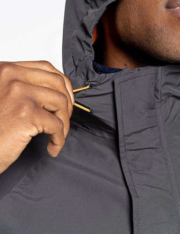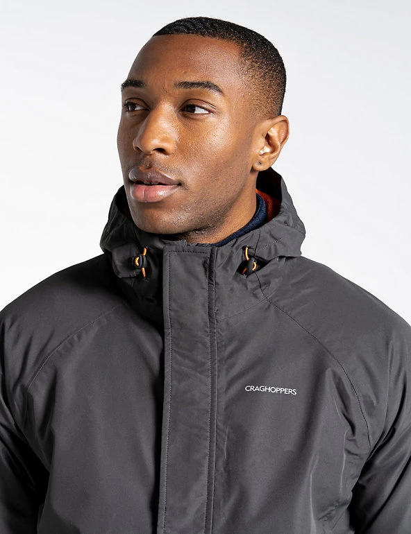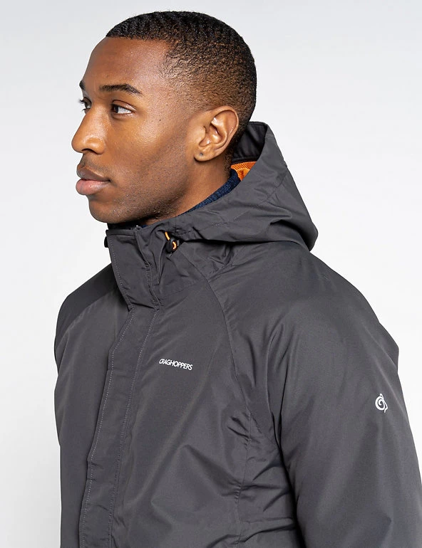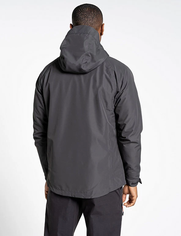 Opt for all-around protection from the elements with this hooded jacket from Craghoppers. It’s cut to a tailored fit with an adjustable grown-on hood and snug riptape cuffs. With an AquaDry Membrane finish, the coat is both waterproof and breathable. It features a classic zip fastening and two large zipped pockets. An extra inside pocket ensures extra practical storage. Signature branding creates finishing detailing. Made with recycled polyester.