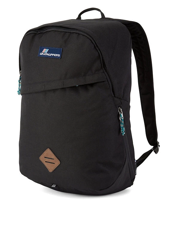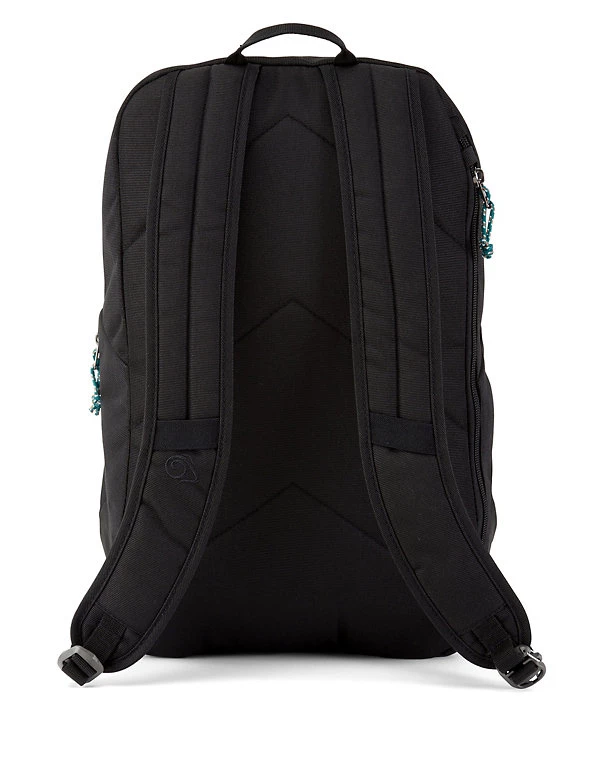 Keep your essentials safe and secure with this backpack from Craghoppers. It features a large main compartment that holds up to 22L, with extra side pockets and a separate, padded compartment for your laptop or tablet. The back panel and shoulders are padded for comfort, with adjustable straps for your best fit. Use the café strap to keep your bag secure and the gear loops for any attachments. It fastens with a secure zip, complete with recycled tape, and has reflective details for early morning or evening adventures. This piece features a water-repellent EcoShield finish. Made with recycled polyester.