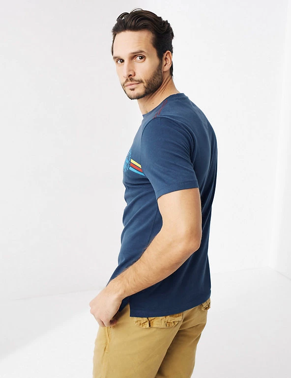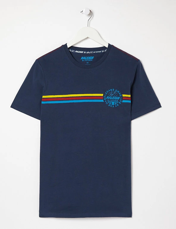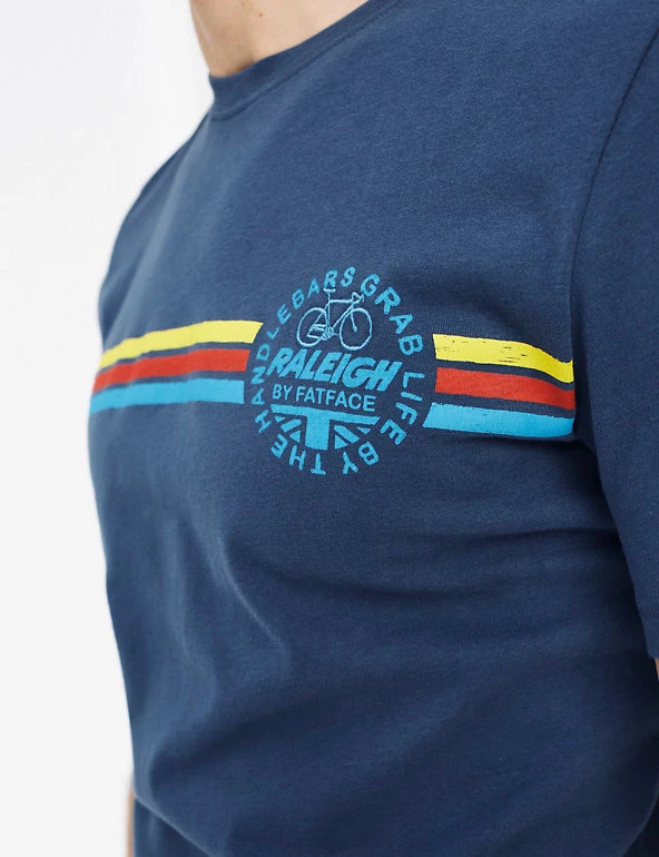 Show off your love of biking with this pure cotton Raleigh t-shirt by FatFace. It’s crafted in a regular fit for comfort and has short sleeves and a classic crew neck. This sporty design is finished with a stripe design and a ‘Grab life by the handlebars’ slogan on the chest.
