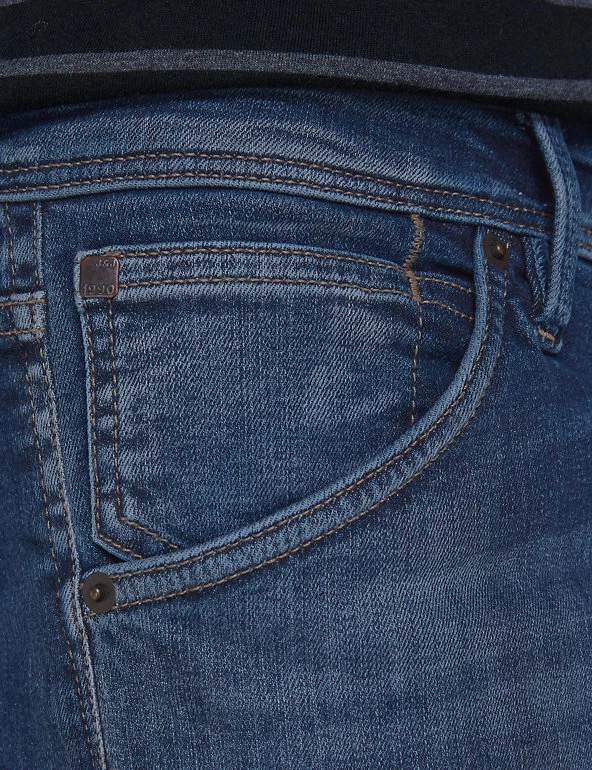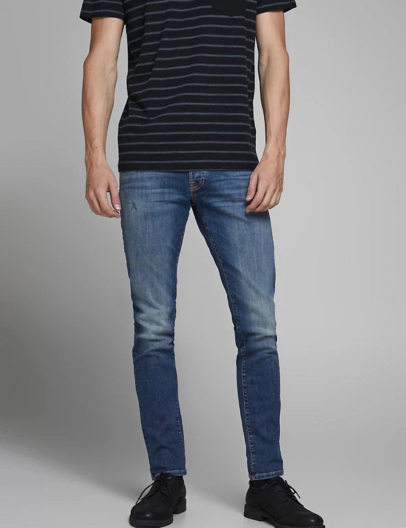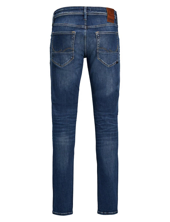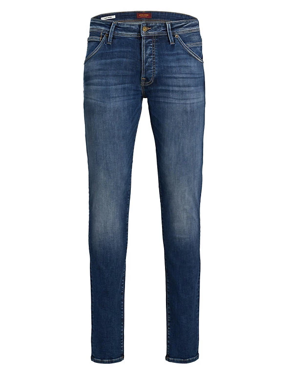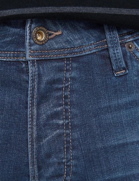 These slim-fit jeans from JACK & JONES give you a sleek, modern silhouette without feeling tight. The fit is lean through the leg, with cotton-rich denim including added stretch. This style takes the classic design and adds playful details such as slanted front pockets, pointy pockets at the back and a square rivet on the coin pocket.
