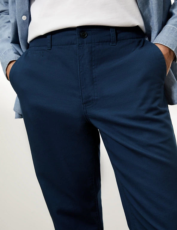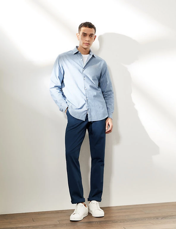 Add to your smart-casual favourites with these pure cotton trousers by Jaeger. Cut in a classic regular fit, they feature a modern flat front and button-fly detailing for a tailored touch. Their soft handfeel and internal chambray fabric ensure a comfortable wear. Dress them up with a shirt for the office, or take it casual with a t-shirt and trainers.