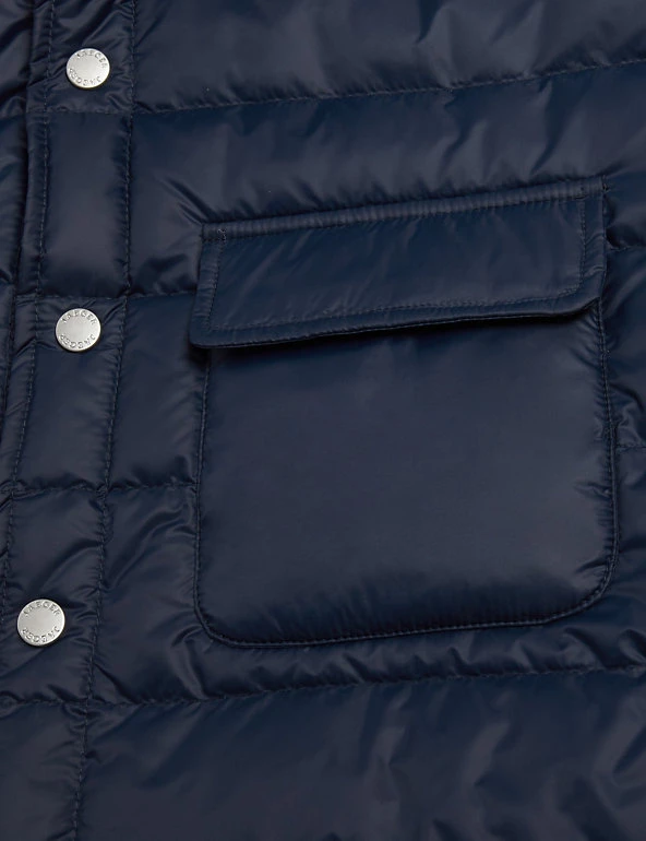 This Jaeger puffer jacket is an ideal light insulating layer for in-between seasons. It’s made in a comfortable regular fit, with convenient popper fastenings and a smart collared neckline. Pockets at the waist provide handy storage, while patch pockets on the chest add cool urban detailing. The windproof material shuts out chilly draughts, plus it’s water-resistant so you stay dry in a shower. Made with recycled feather and down.