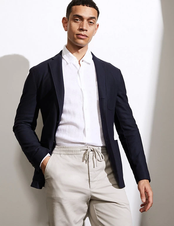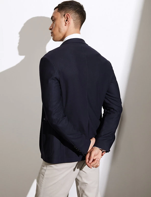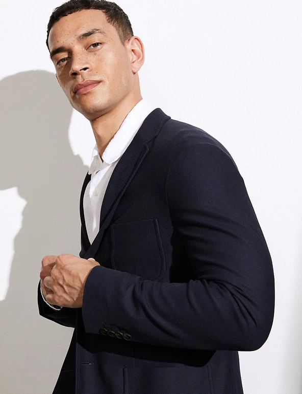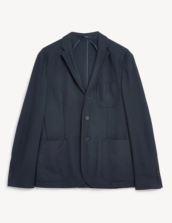 Slide on this pure cotton jacket from Jaeger for a smart look. Crafted to a regular fit from breathable Italian fabric, it has a single-breasted triple-button front below the neat lapel. A slight stretch in the pique jersey fabric allows for easy movement. Finishing touches include bound internal seams and three handy patch pockets. Pair it with a shirt and chinos for smart workwear, or combine with a white t-shirt and jeans for a more relaxed look.