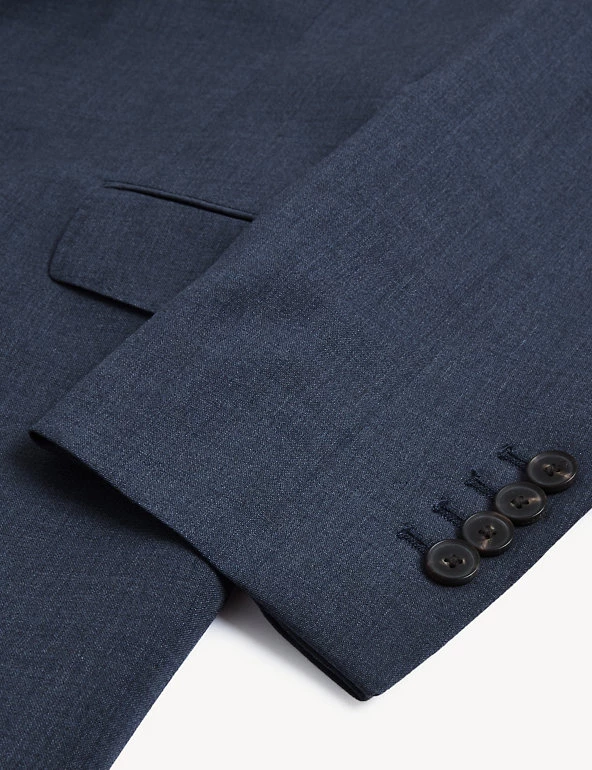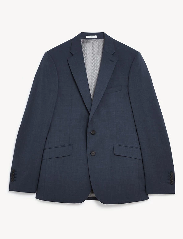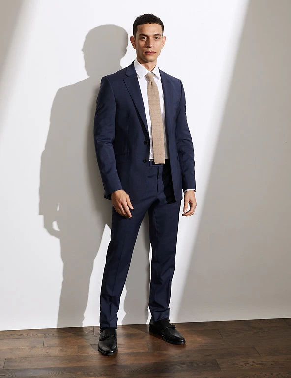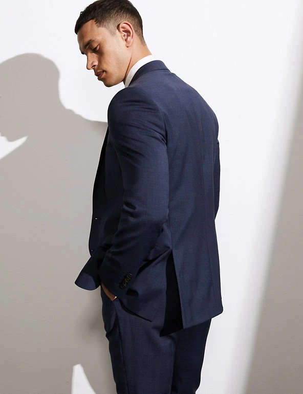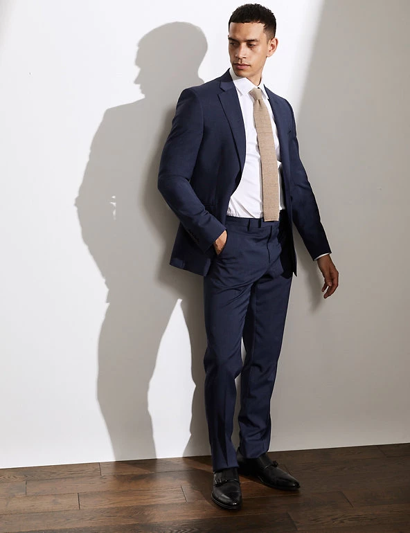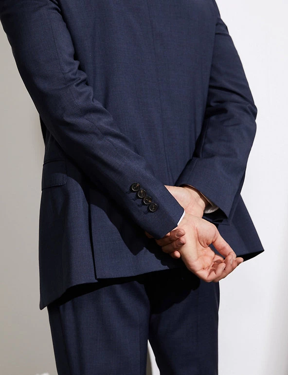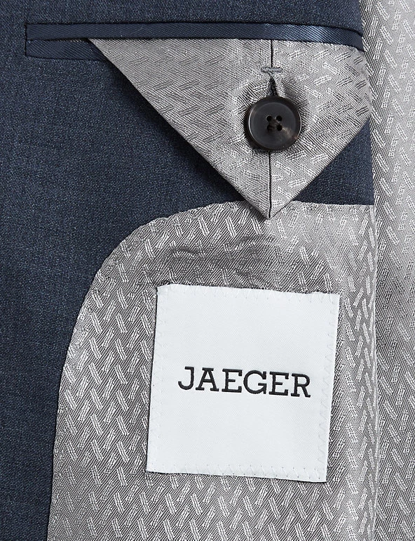 Thanks to its pure wool Italian-woven fabric, this Jaeger jacket has a refined and luxurious look that’s perfect for formal dressing. Crafted with extra-fine fabric from Italian mill Marzotto, it’s cut to a contemporary slim fit in a single-breasted style with a two-button fastening. A clever half-canvas construction makes it light and adds easy movement, letting the garment mould to your body. Breathable fibres ensure effortless comfort, while a touch of natural stretch in the wool makes it crease-resistant. Columbia stitching to the jacquard lining and working buttons at the cuffs add subtle finishing detail. Matching trousers are available.