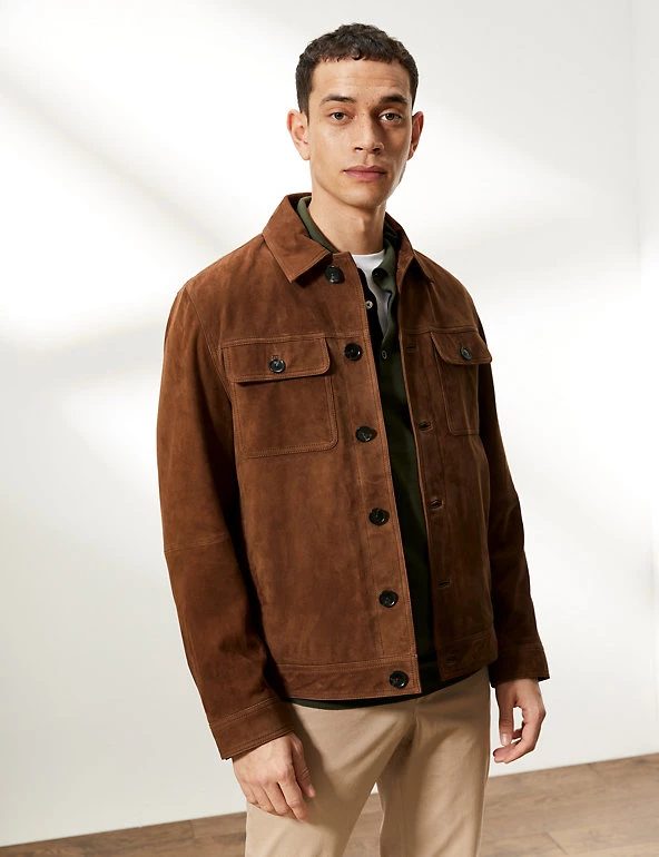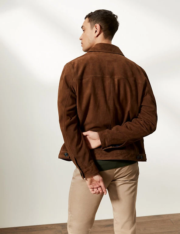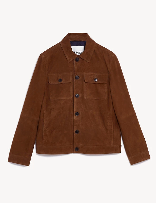 This luxe Harrington jacket from Jaeger gives Western-inspired style a contemporary update. It’s cut to a comfortable regular fit, with a timeless collared neck and working button cuffs. Made from soft goat suede that will age beautifully over time, this piece will develop its own patina to create a garment that’s unique to you. It’s fully lined for comfort, and finished with refined, twin needle topstitch detailing. Wear yours over knitwear, with indigo jeans and trainers, for sophisticated weekend style.