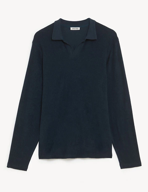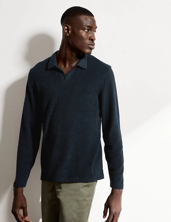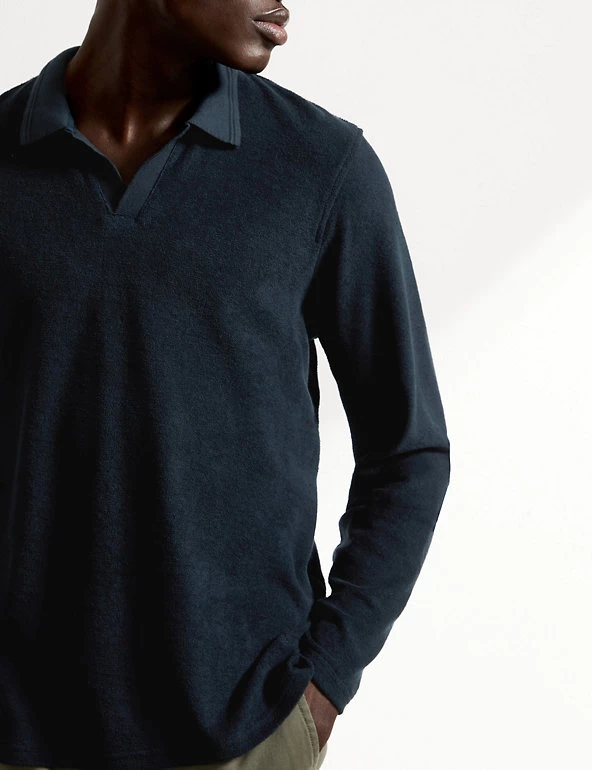 Expand your essentials collection with this pure cotton polo shirt from Jaeger. Crafted from laundered terry towelling cloth with a super-soft, brushed hand-feel, this regular-fit design is in equal parts comfortable and stylish. It features a flattering open collar and long sleeves for day-to-night dressing. Team this versatile piece with a light jacket and shorts for easy summer style, or your favourite swim shorts for a casual look.