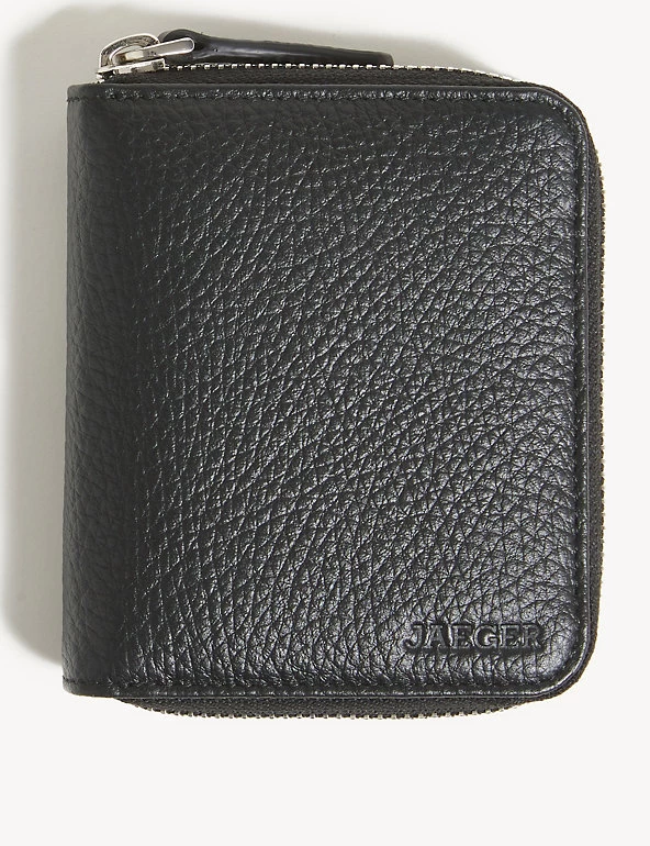 Keep your money safely stowed in this secure zipped wallet from Jaeger. It’s made from soft grain leather for a premium look and feel. Inside are slots for cards and cash, as well as a pouch for coins. Made with responsibly sourced leather.