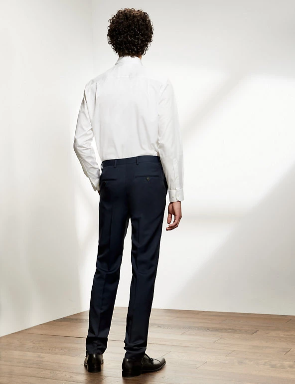 These contemporary slim-fit trousers from Jaeger offer a sharp look for both casual and formal outfits. They’re crafted from pure wool fabric woven at Italian mill Marlane and feature a classic flat-front design. Subtle waisted pockets and jetted back pockets with tortoiseshell buttons add functional detailing. These trousers are lined for comfort and are finished with a concealed hook bar and zip fastening.