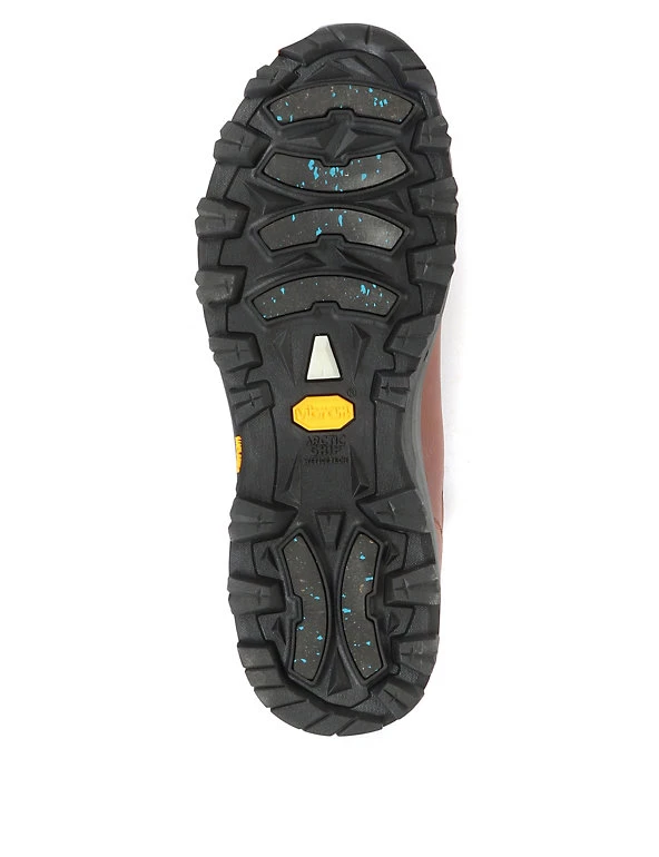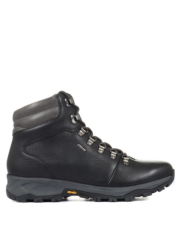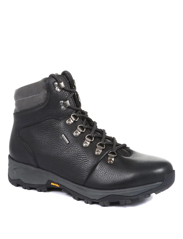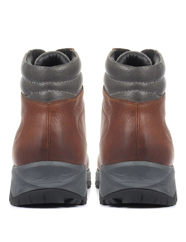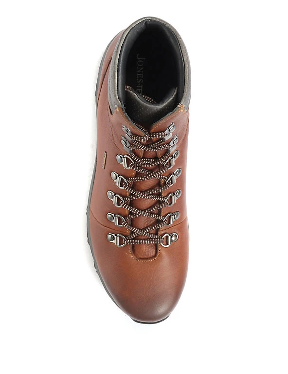 With their hiker-style look, these chunky leather boots from Jones Bootmaker are an ideal choice for weekend adventures. They’re made in a comfortable regular fit, with secure lace-up fastenings. Padded collars at the ankles give extra support and protection, while deep cleating on the soles provides plenty of grip. Branded metal hardware adds a discreet finishing touch.