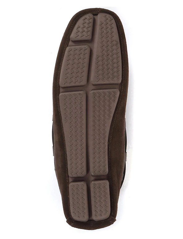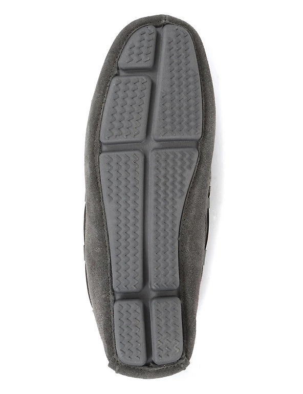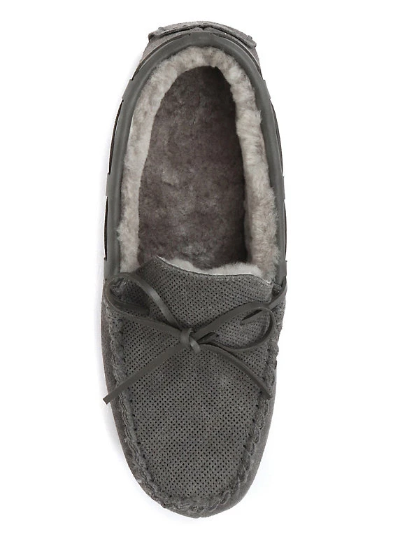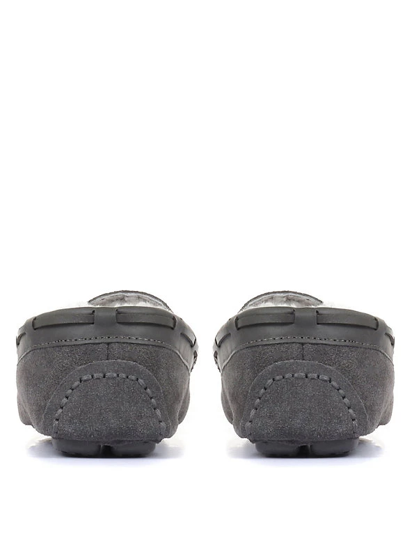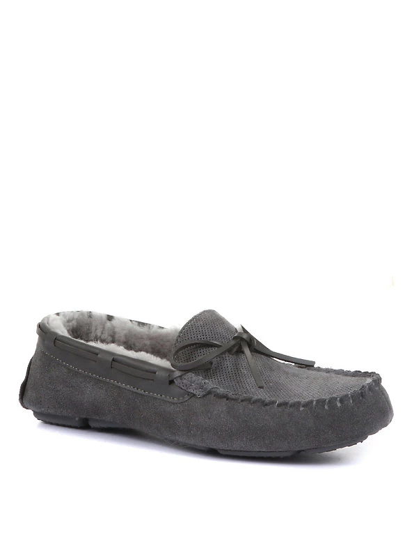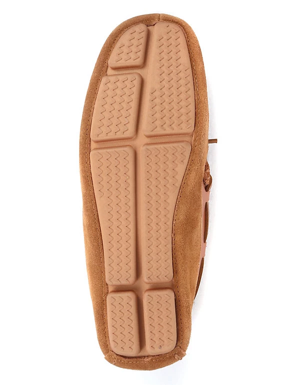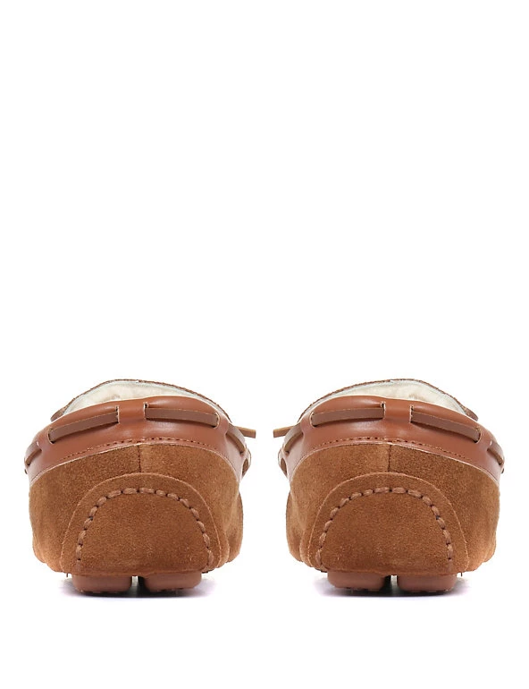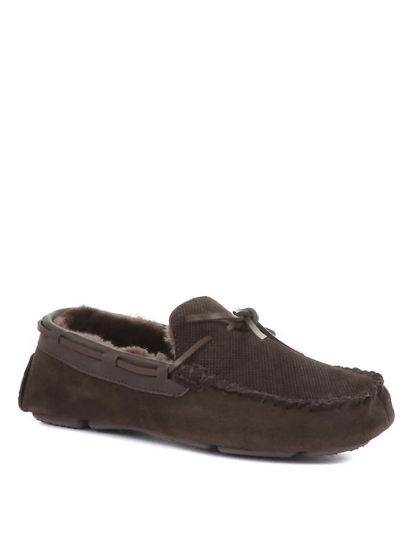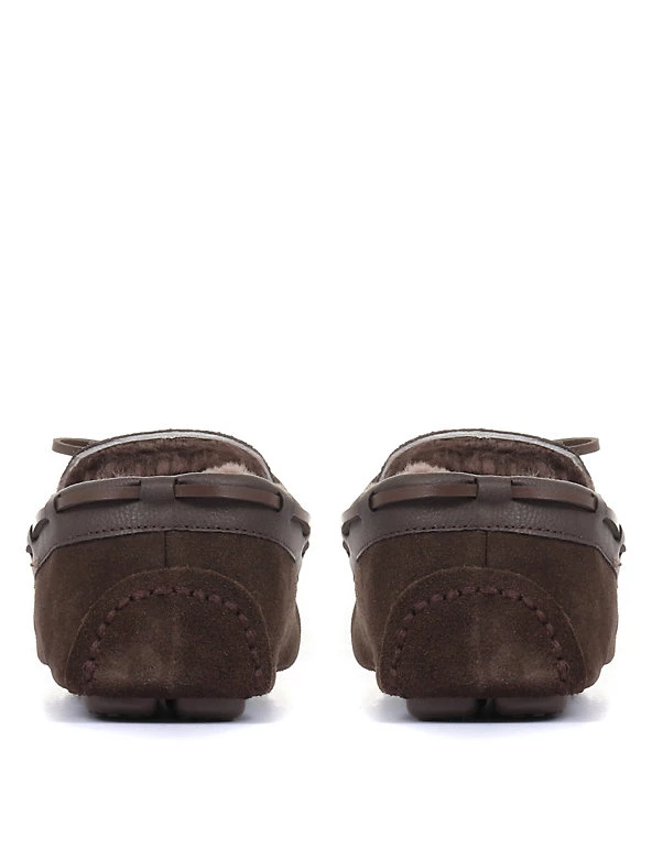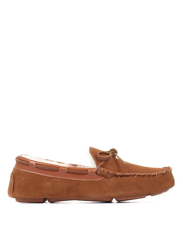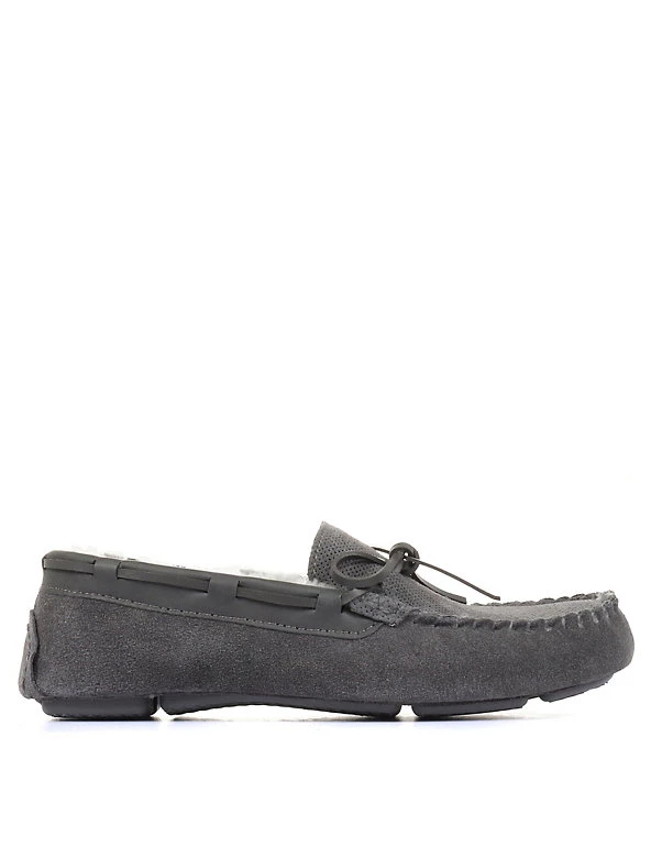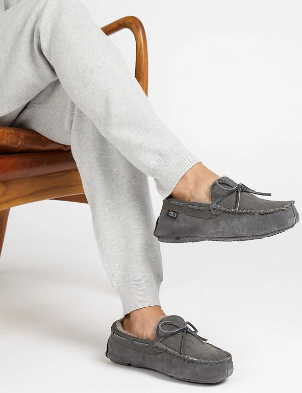 Keep feet warm and cosy around the house with these suede moccasin slippers from Jones Bootmaker. The easy slip-on design includes a soft sheepskin lining and a bow detail at the front.