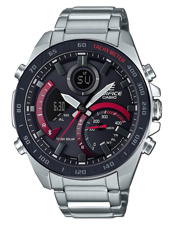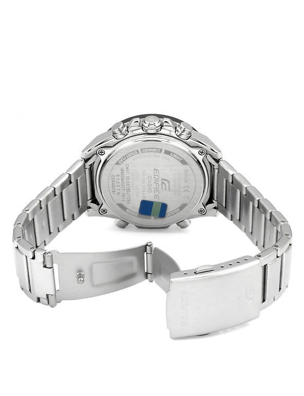 This intelligent timepiece from Casio is full of innovative features to help your day run smoothly. It is solar powered, so you won’t need a battery, and bluetooth compatible, so you can connect to your smartphone to upload your training data to your phone. Features include five daily alarms, a 24-hour countdown timer and a stopwatch with 200-lap tracking. As it’s also water-resistant to 100m, this watch is perfect for swimming. The black motor sport-themed dial displays the time with minimalist indices, alongside sub-dials and digital displays for the day of the week and alarm time.