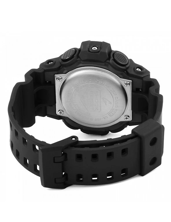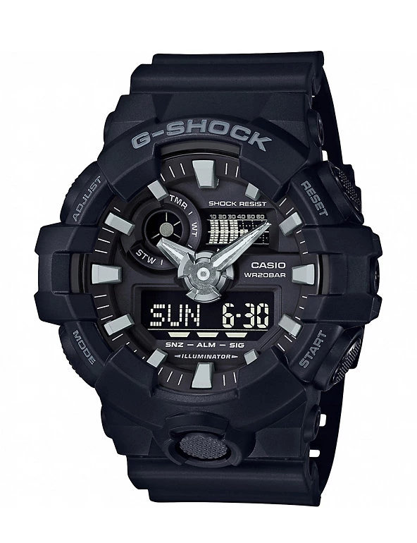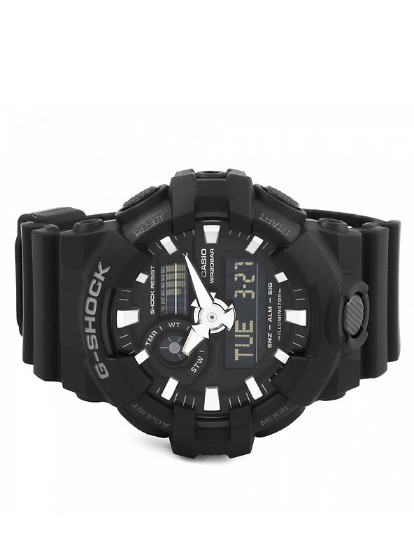 Turn to the hardwearing G-Shock watch from Casio for accuracy and style. It has a durable black strap for a sporty aesthetic and features a buckle closure. This international timepiece is shock-resistant and features a world clock function that displays the time zones of 26 countries. It also has an auto-calendar and an alarm. The LED backlight and water-resistance of 200m provides further practicality, while the chronograph function enables you to use it as a stopwatch and timer via the side buttons.