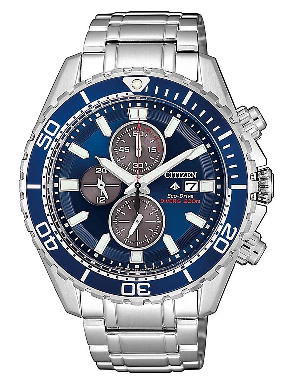 This Promaster Diver’s watch from Citizen is designed for the sophisticated adventurer. The bold blue dial features luminous white hands and time batons, with a date window at 3 o’clock. Subdials display both seconds and minutes as well as a 24-hour format. A chronograph design means it can be used as a stopwatch and remain waterproof up to 200 metres. A stainless steel bracelet with clasp fastening adds a classic finish to a daring timepiece.