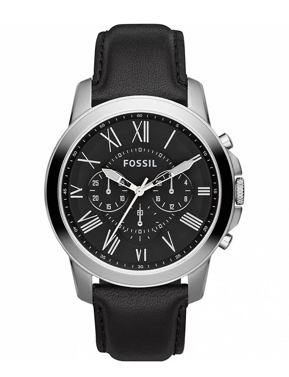 Add luxe appeal to day and night with this sophisticated Grant watch from Fossil. This classic timepiece has a black leather strap with a contrasting stainless steel buckle and bezel. The black dial features Roman numerals with a minute counter around the outside. Three sub-dials sit in the centre of the face and display the date, hour and second. The chronograph function enables you to use it as a stopwatch, which is operated with the side buttons. Water-resistance of 50 metres gives extra peace of mind when out and about.