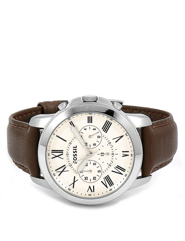 Add timeless style to your outfits with this elegant Fossil leather watch. Roman numeral hour markers and slender hands are set against a classic white circular face with minimal Fossil branding. Three sub-dials display the date, hour and minutes and the chronograph design means it can also be used as a stopwatch. It’s also water-resistant up to 50m. The crafted brown leather strap has a classic buckle fastening and provides comfortable day-to-day wear.