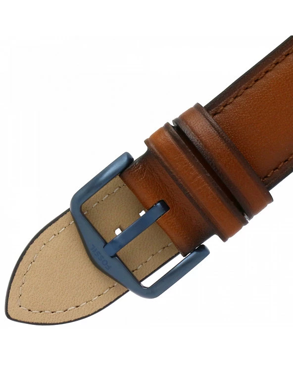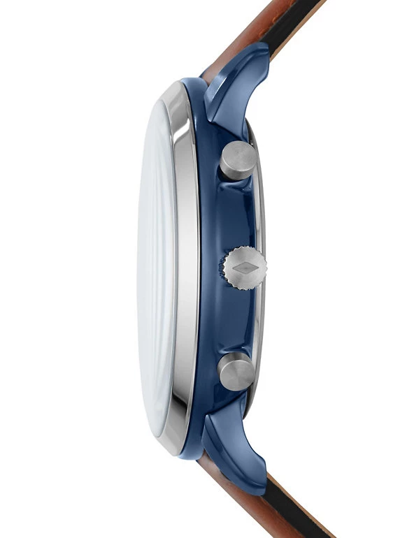 Opt for a stylish timekeeper with this chronograph watch from Fossil. A vibrant blue dial is contrasted against the soft tan leather strap and stainless steel frame. The dial features two Roman numerals with baton markers and a date window between 4 and 5 o’clock. Three chronograph subdials include the date, hour and seconds and conveniently double up as a stopwatch. The watch is also water-resistant to 50 metres for an extra dose of practicality.