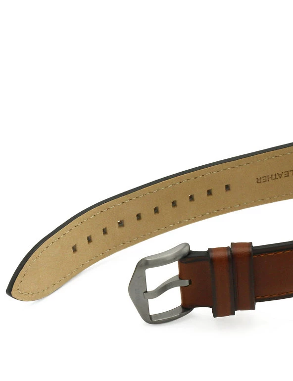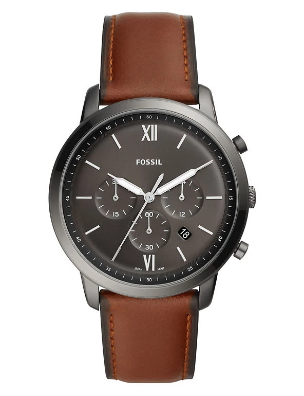 This elegant leather watch from Fossil features white hands and markings on a charcoal grey face, creating a stylish look. Twelve and six o’clock are marked with Roman numerals, with a bar for all the other hours. Minutes are marked around the outside of the dial and numbered every five minutes. There’s also a date window between four and five o’clock, plus three sub-dials with a chronograph minute hand, second hand and 24-hour hand. The buckled strap is crafted from smart brown leather. It’s water-resistant to 50 metres.