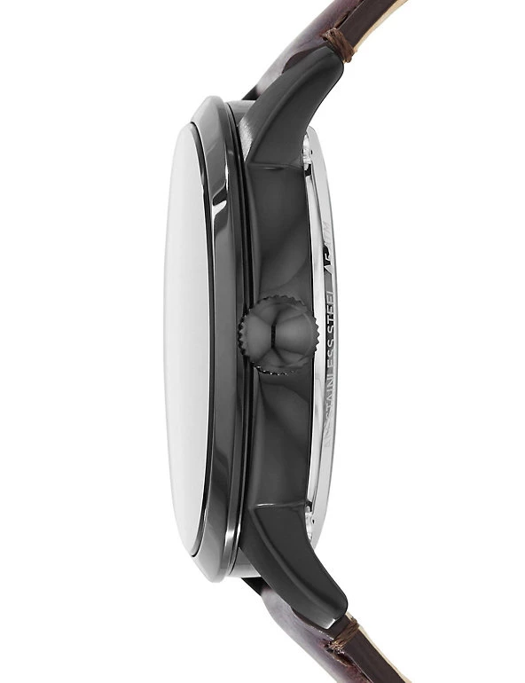 This unique watch from Fossil is a stylish conversation-starter. The circular brown face features Roman numeral hour markers at 12, 3, 6 and 9 o’clock, plus indices for the remaining hours and smaller markers for seconds. There’s a beautiful skeleton dial in the centre to show-off the inner workings of this automatic watch, which are also visible through the transparent case back. The dial is held in a deep brown stainless steel case and has a brown leather strap that fastens with a branded buckle. This watch is water-resistant to a depth of 50m.