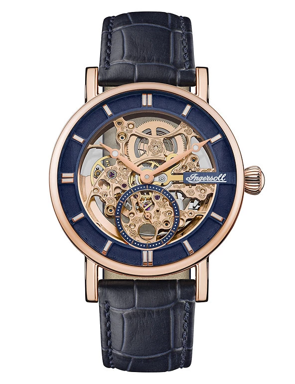 With its bold gold casing and contrasting navy details, the Herald watch by Ingersoll is a true statement piece. Its automatic mechanism is powered by your body’s natural movements, to keep it charged without the need for winding or batteries. The dial features an exposed skeleton interior complete with cogs, jewels and springs for a timeless feel. Around the face, gold batons are set against a blue textured background to mark out the hours. The navy leather strap has a croc-effect finish for extra luxe and is fastened with a buckle.