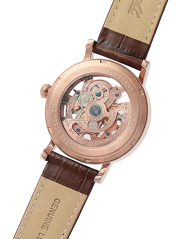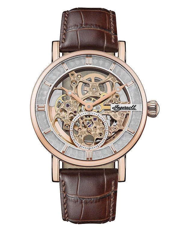 This striking watch from Ingersoll is a classic to wear forever. The dial features an elegant rose gold bezel and crown along with a large skeleton dial showing off the inner workings of this sophisticated timepiece. The baton hour markers are tracked with slim hands, and there’s a matching sub-dial to track seconds. A water resistance of 50m makes it ideal for everyday wear, and the croc-effect leather buckle strap adds a premium finish. Plus, it’s powered by wrist movement, so there’s no need to replace batteries.