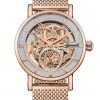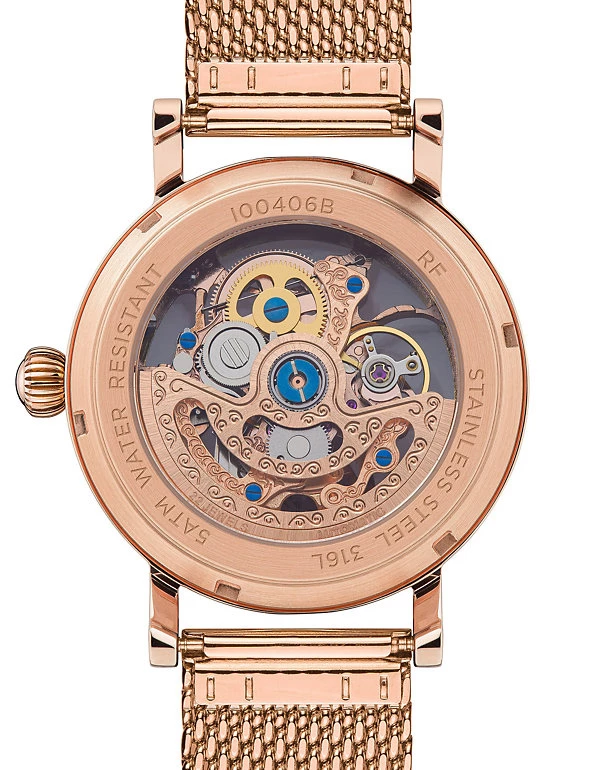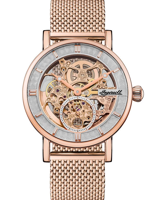 The Herald analogue watch by Ingersoll combines a traditional look with contemporary craftsmanship. A substantial gold-tone case houses an intricate skeleton mechanism, with the cogs, jewels and springs all visible. Around the dial, a silver-tone surround is embellished with subtle wave patterns, contrasting with the gold baton hour markers. Its automatic movement is powered by the natural movements of your body, so you never need to worry about winding it. Plus, the understated mesh bracelet has a fully adjustable fastening for maximum comfort and comes with a water resistance of 50m.