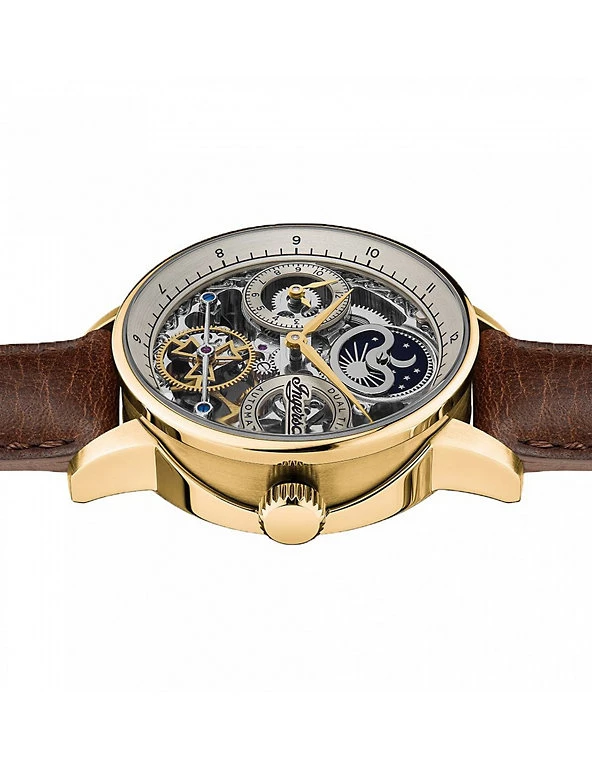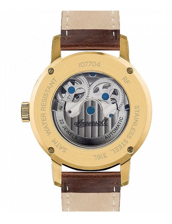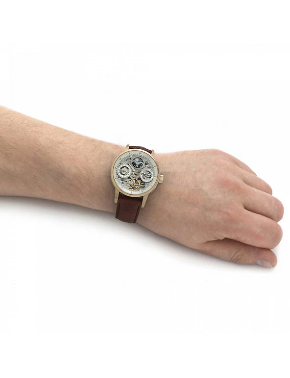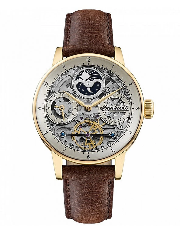 Channel the dynamic style of the Jazz Age with this intricately designed timepiece from Ingersoll. Its multidimensional dial combines delicate skeleton cut-outs showing the inner workings of the watch with decorative swirl engravings. As well as automatic dial arms, there are two subdials that give you dual time functionality and a day and night feature. The watch is water-resistant to 50 metres and has a smooth leather strap in brown for a traditional look.