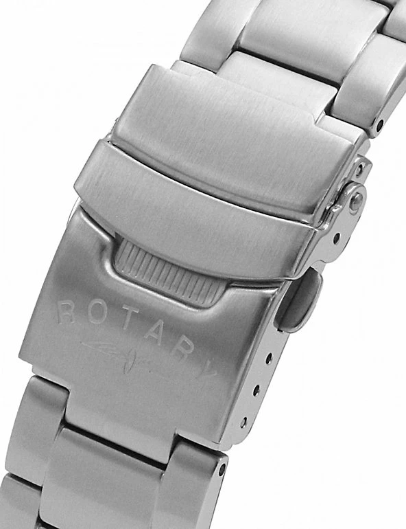 The Rotary Hero watch is a modern design that’ll fit seamlessly into your routine. A stainless steel case, complete with hour markers, surrounds a dark dial with luminous arms and mixed-shape indices. This chronograph can also be used as a stopwatch, activated by two matching pushers. Two small subdials track hours and minutes, and there’s a date window to help you stay organised. This watch is powered by quartz for accuracy and is water-resistant to 100m, making it perfect for the likes of swimming.