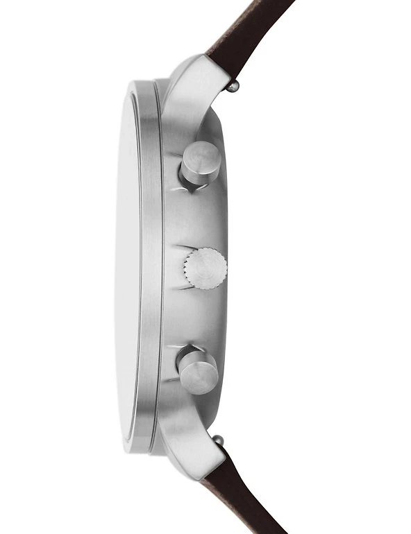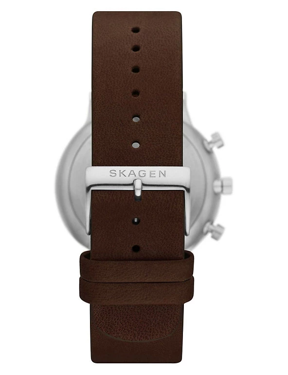 This Skagen Ancher watch is a modern and practical piece for everyday wear. Its minimalist stainless steel case houses a blue dial with luminous hands for a striking look. It is numbered at 6 and 12 o’clock, with elegant indices marking the other hours. Chronograph functionality means it can be used as a stopwatch with three subdials for accuracy. The watch is water-resistant up to 50 metres, and a smart brown leather strap with buckle fastening adds a classic finish.