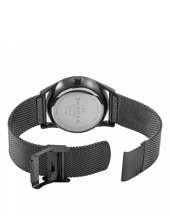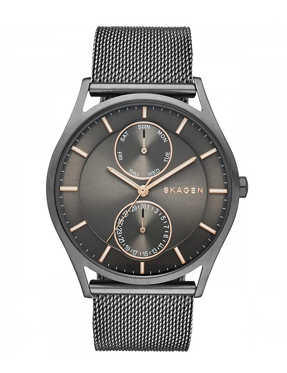 This Skargen quartz-powered watch blends sophisticated style with reliable precision. The classic round dial features separate day and date sub-dials and slender hands. The rest of the face is minimal, with repeat hour and second markers set against a plain grey background with a small brand logo. A water-resistant finish of up to 50m makes this piece perfect for everyday use. The adjustable mesh bracelet is finished with a clip fastening, giving this classic analogue design a modern touch.